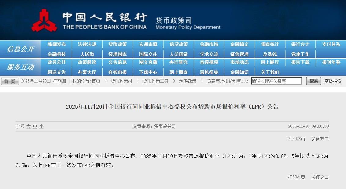 【大河财立方消息】11月20日,11月贷款市场报价利率(LPR)报价出炉:5年期以上LPR为3.5%,上月为3.5%。1年期LPR为3%,上月为3%。