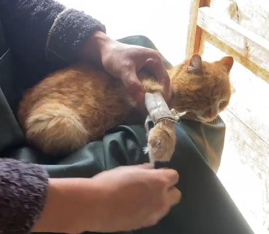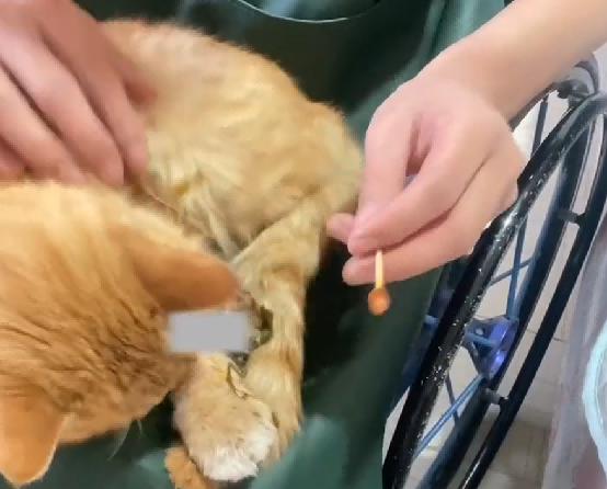 取掉扎带时,小哥前后试了几种方式都不行,最后只能用剪子一点点硬取下来,整个过程看着就很疼,猫咪很抗拒,但是它没跑。