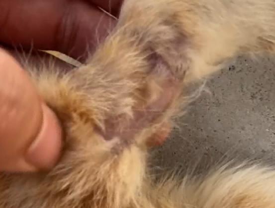 好不容易把伤口上的纸巾清理干净,结果小哥又发现,猫咪的伤口上海绑着一根扎带,因为时间太长,皮肤溃烂,扎带已经长到了肉里。