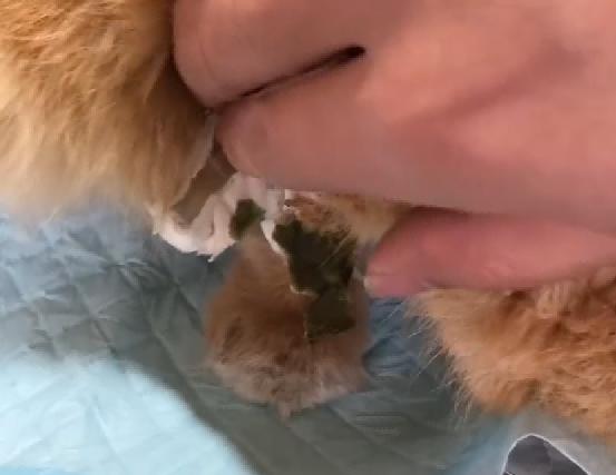 小哥把大橘抱进屋里,仔细检查它的伤口,发现大橘腿上的伤口非常严重,而且伤口上面还被人包了一层纸,因为伤口已经化脓,纸被牢牢粘在了上面。