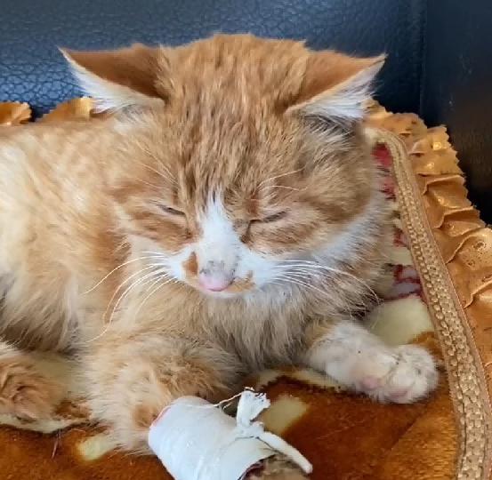 大橘趴在那喵喵叫,叫它也不过来,小哥上前一看才发现,原来大橘的腿受伤了。