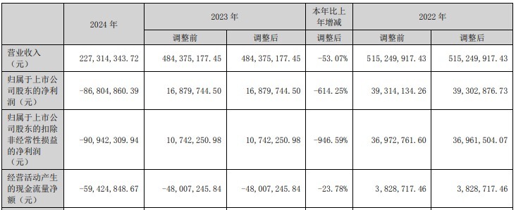 恒锋信息净利连降4年后去年转负,近6年经营活动产生的现金流量净额有5年为负数。2019年至2024年,恒锋信息营业收入分别为5.67亿元、5.02亿元、6.12亿元、5.15亿元、4.84亿元、2.27亿元,归属于上市公司股东的净利润分别为0.61亿元、0.59亿元、0.47亿元、0.39亿元、0.17亿元、-0.87亿元,归属于上市公司股东的扣除非经常性损益的净利润分别为0.58亿元、0.52亿元、0.42亿元、0.37亿元、0.11亿元、-0.91亿元,经营活动产生的现金流量净额分别为-0.36亿元、-0.30亿元、-0.65亿元、0.04亿元、-0.48亿元、-0.59亿元。