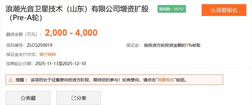 【大河财立方消息】11月18日消息,浪潮集团旗下浪潮通信技术有限公司增资扩股项目、浪潮光音卫星技术(山东)有限公司增资扩股(Pre-A轮)项目近日在山东产权交易中心挂牌。上述项目分别拟融资0.5亿元~1.5亿元、2000万元~4000万元。挂牌起始日期分别为11月18日、11月13日,信息公告日为20个工作日。